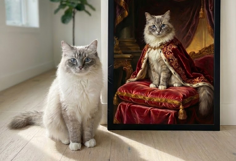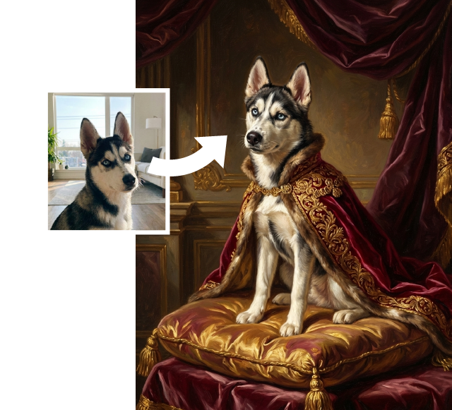 Our advanced AI transforms your pet into a classical oil painting masterpiece